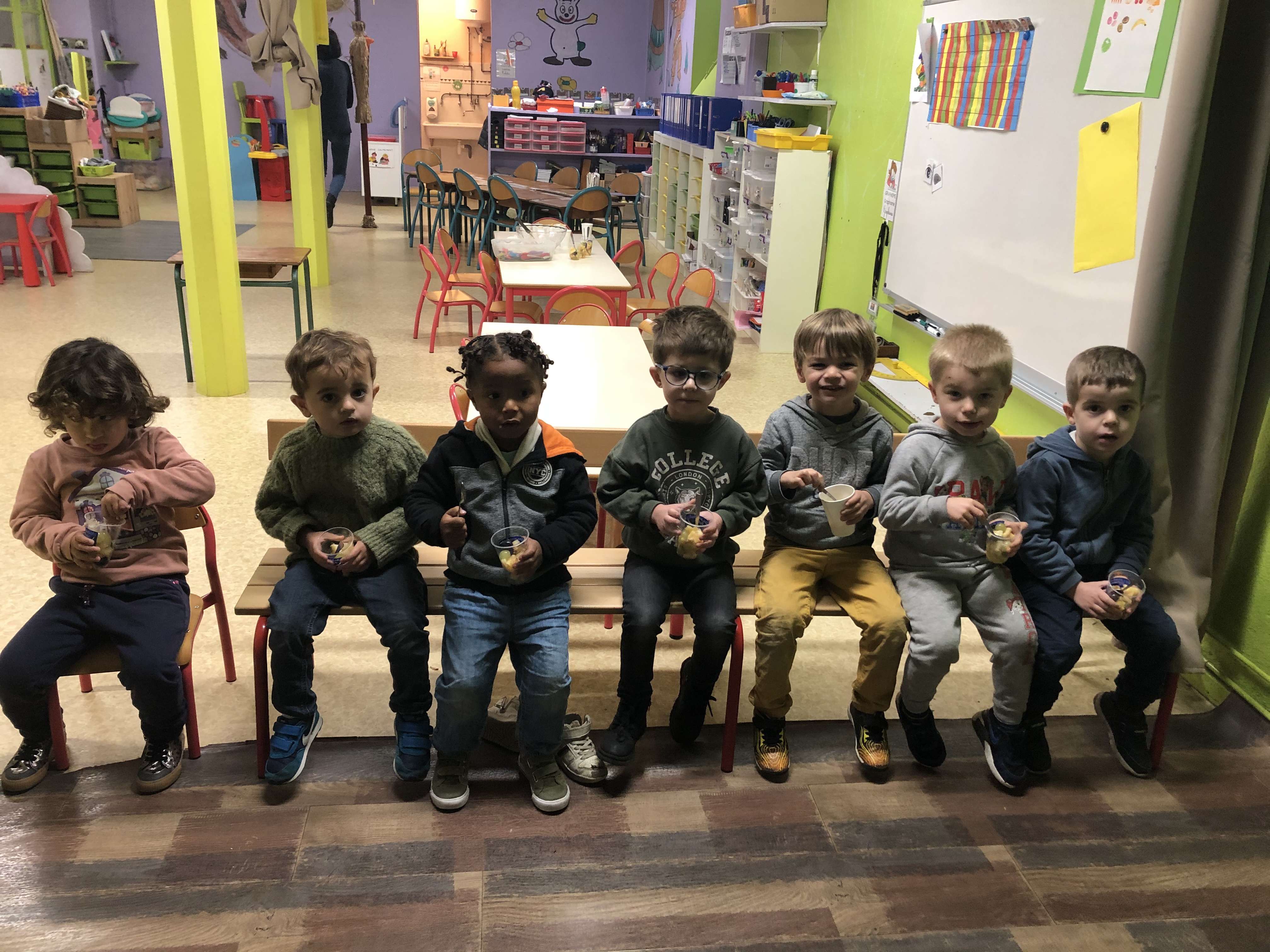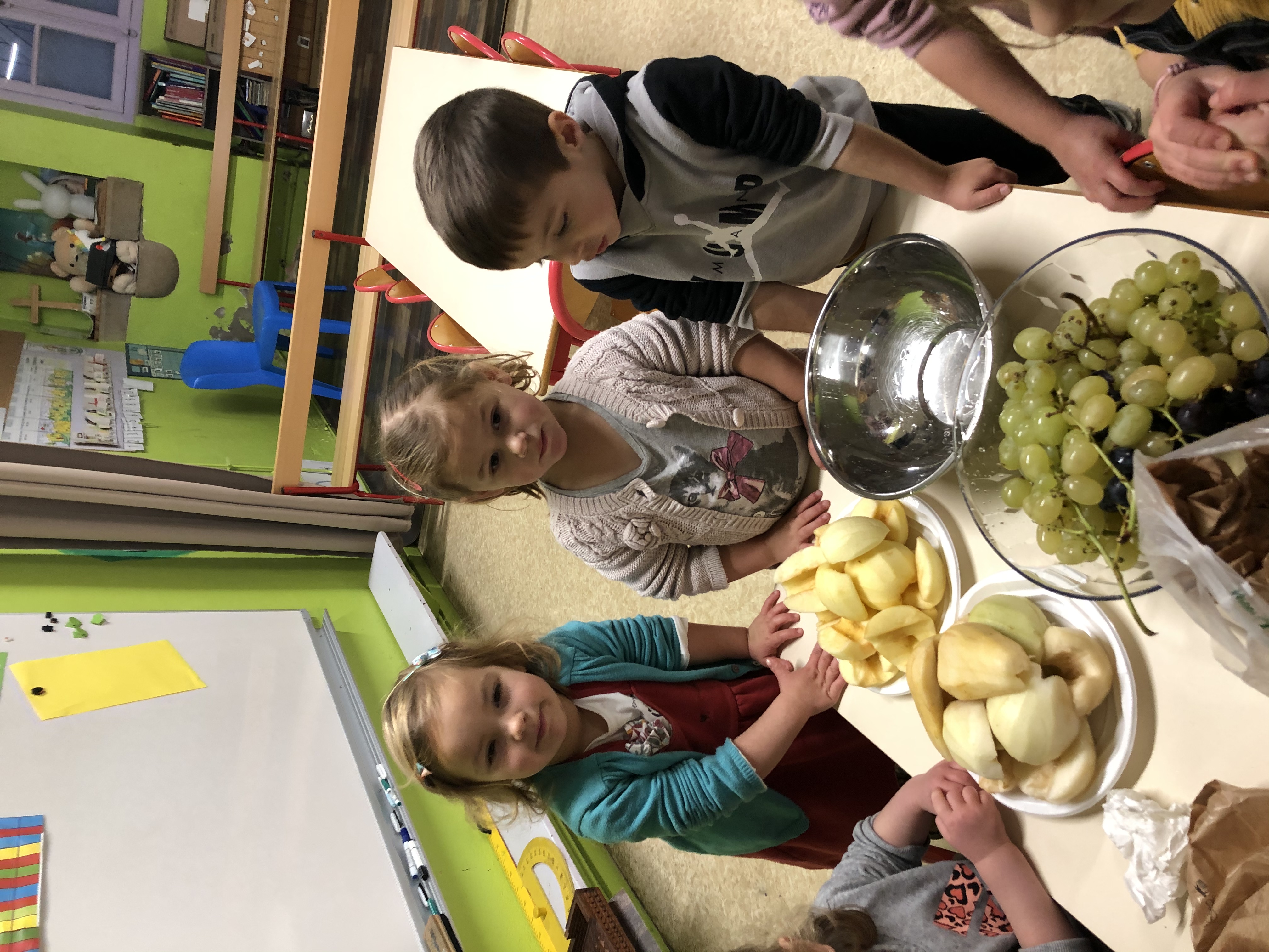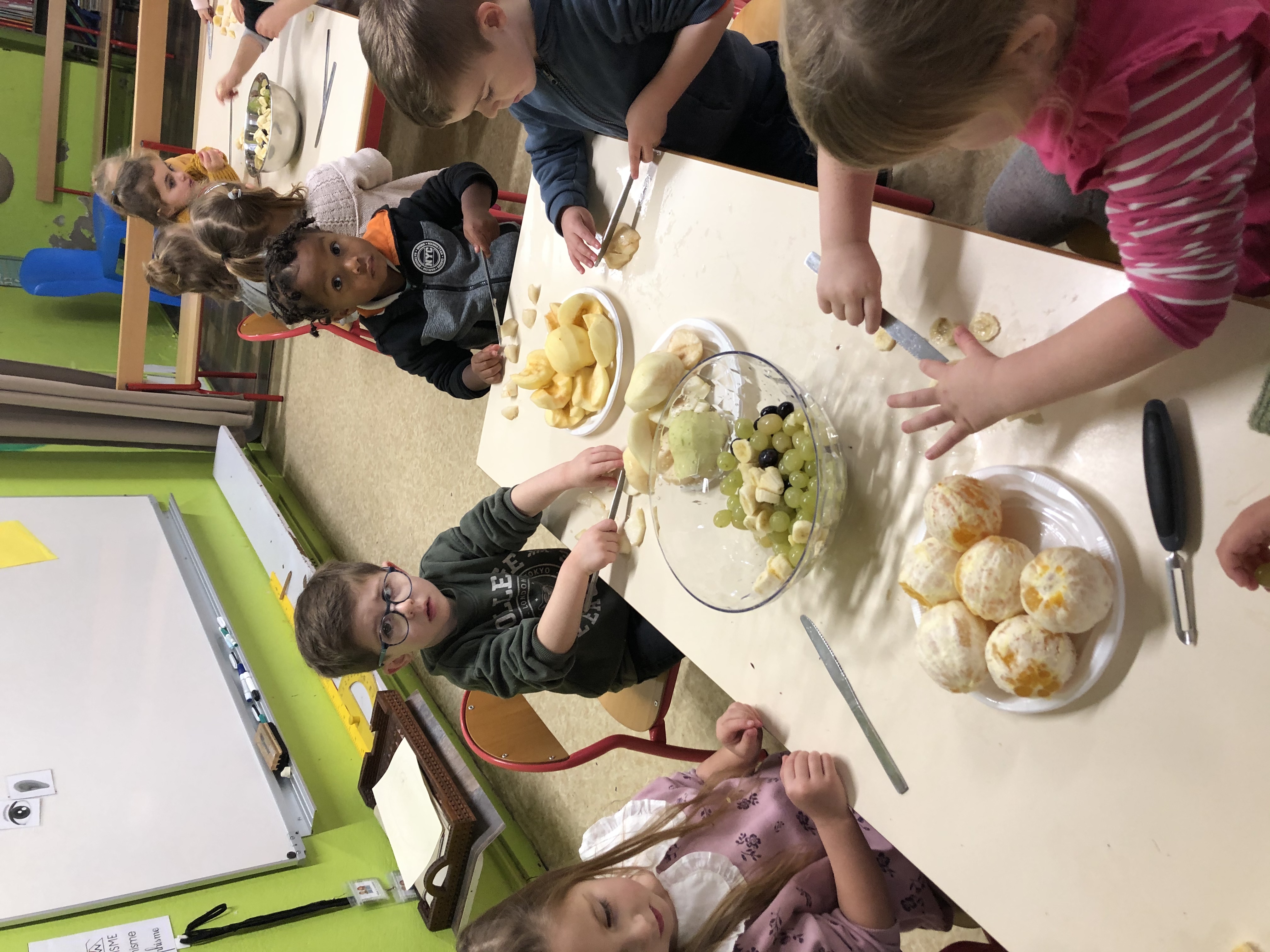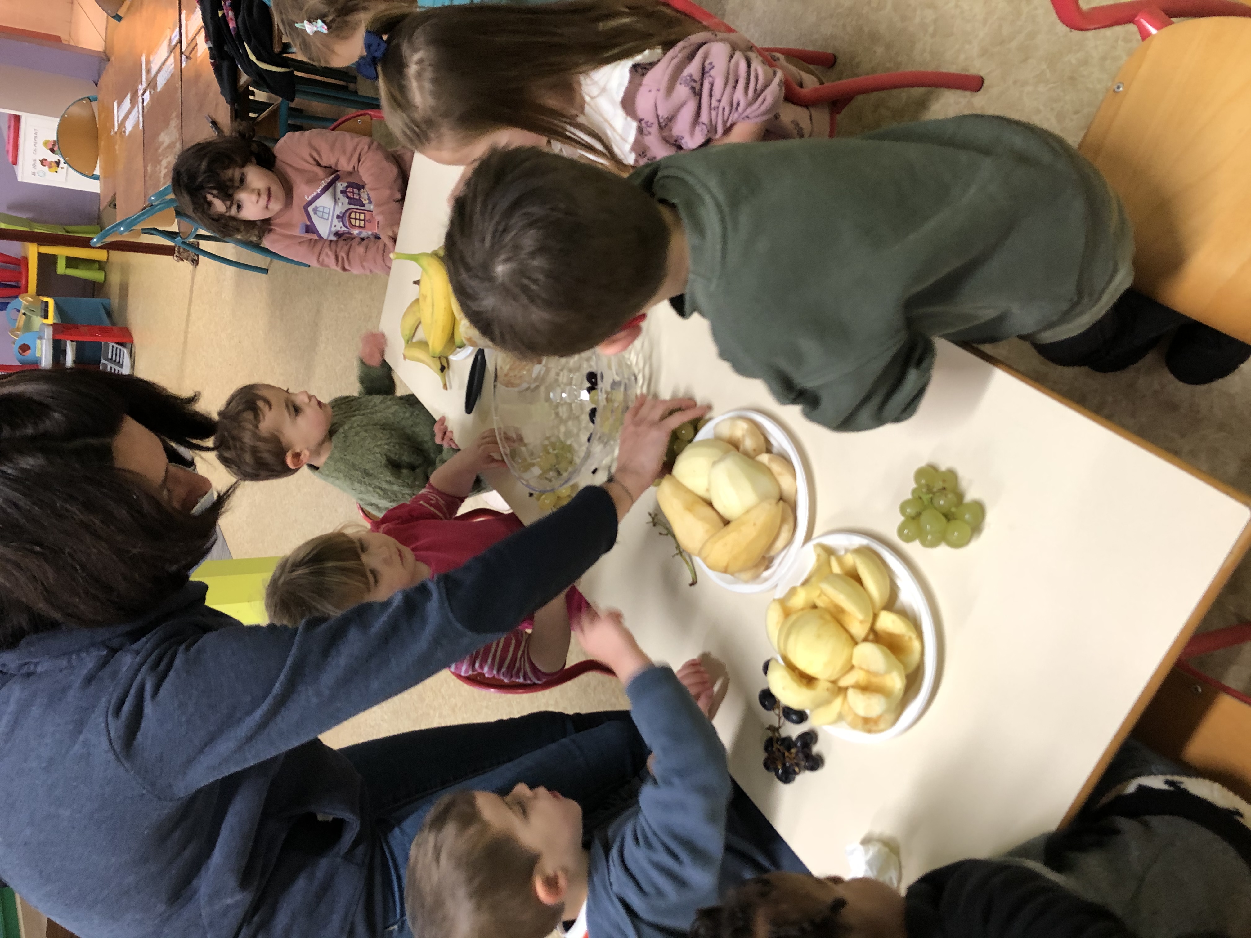 La classe de TPS/PS/MS a étudié l’albumcréé par la CPAM afin de lutter contre l’obésité infantile.Comme le héros Théo nous avons décidé de réaliser une salade de fruits.Pour ce faire nous sommes allés sur le marché et avons passé commande par petits groupes.Chacun devait rapporter 5fruits ( pomme, poire, banane, orange, raisin).